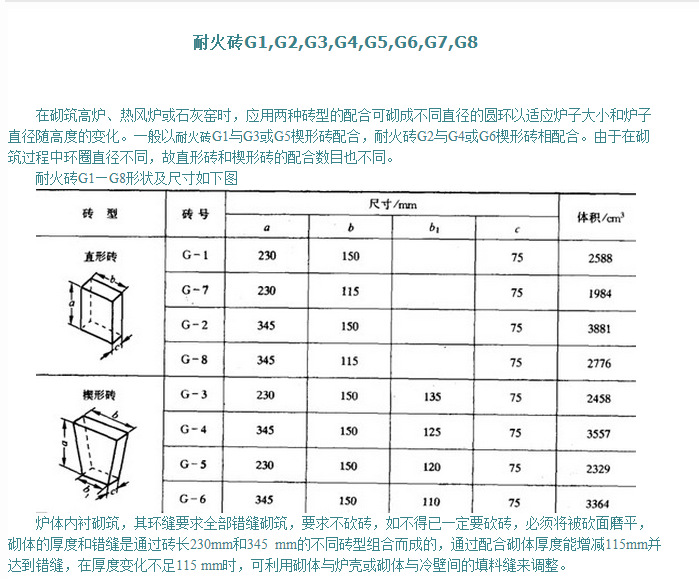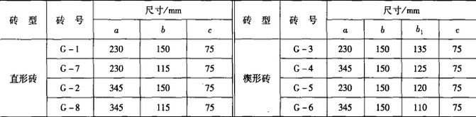 如果單獨(dú)用G-3、G-4、G-5、G-6楔形磚砌環(huán)圈可列出式:nx=(2πa)/(b-b1)式中nx——砌—個環(huán)圈的楔形磚數(shù),塊;a——磚長度,mm; b——楔形磚大頭寬度,mm;b1——楔形磚小頭寬度,mm。