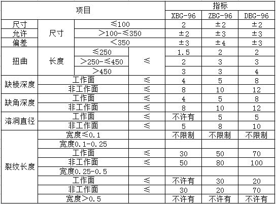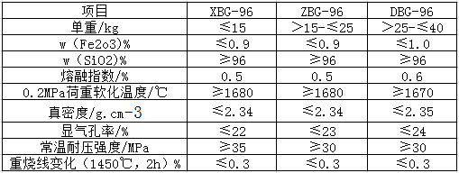 玻璃窯用優(yōu)質(zhì)硅磚制品標(biāo)準(zhǔn)為JC/T615-1996,按磚的單重分為3個牌號:XBG-96,ZBG-96,DBG-96. 其理化指標(biāo)及尺寸允許偏差如下表: